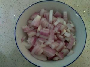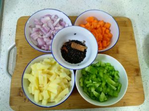 所有蔬菜切成丁,香料芝麻放一起备用。土豆要防止氧化,可以浸在水里!