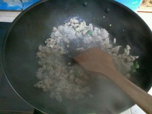 坐锅烧热油,葱段姜末蒜末先下锅炒出香味,放入肉末,倒入料酒,翻炒至白色。出锅备用。