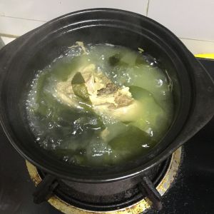 水开后捞掉血沫,加入一小碗冷水继续煮。再次煮开后放入洗净的裙带菜。