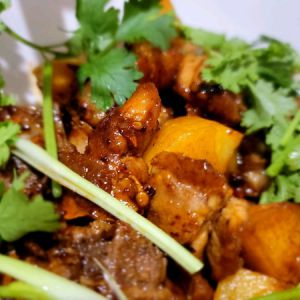 倒入土豆翻炒均匀,我懒,就不炸了直接丢进去啦~不然正宗做法需要土豆也提前炸至表面金黄。