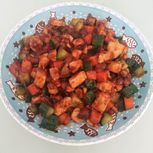 之后加入胡萝卜翻炒一会,再加入黄瓜,花生米翻炒一小会,再加入炒好的鸡肉,翻炒均匀,最后加入调好的酱汁倒入锅中,翻炒出锅
