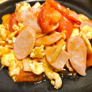 打算切碎,西红柿切小块,火腿肠切成片,鸡蛋打散备用