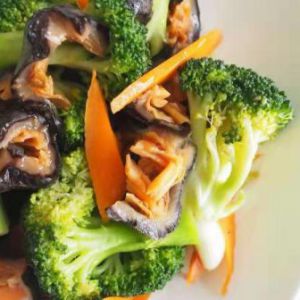8.把西蓝花和胡萝卜放入锅中,翻炒几下,加水淀粉后准备出锅。