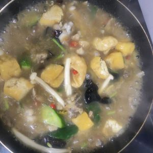 腌制好的田鸡下锅炒一会,捞出,把切好的菇,豆腐泡等放锅里煮开