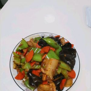 出油后依次放胡萝卜,木耳青椒翻炒至断生,然后加食盐,白糖,十三香生抽调味,再加一点老抽调下色,继续翻炒1-2分钟即可出锅