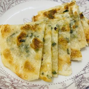 拿一张饺子皮往上面放上葱花,然后再拿一张饺子皮盖上,如此重复叠加,5-6张即可,接着用擀面棍擀成薄片,锅里下油烧热,放入擀好的葱花饼煎至金黄色,期间记得翻