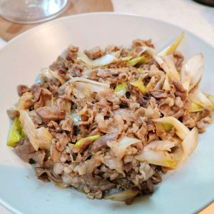 刷干净锅,重新开火锅热倒油,加入腌制好的葱白,炒至变色发黄后加入刚刚炒好的羊肉片一起翻炒,加盐调味,觉得颜色淡可以再加点生抽(或少许老抽)。