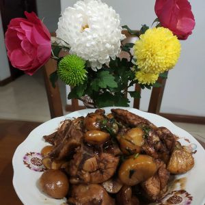 加入蚝油翻炒均匀,再加入板栗翻炒,然后加入足够水