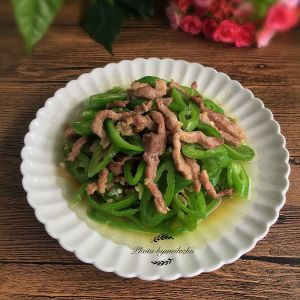 炒至肉丝颜色微变,倒入青椒不停翻炒。