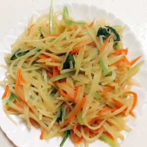 依次放入土豆丝,土豆丝熟的慢一些,需要多炒一会,然后加入芹菜、胡萝卜,翻炒!