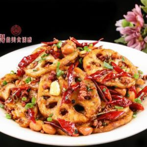 锅烧热,去适量的油,光锅,下入适量的豆瓣酱,炒散炒香,再下入蒜蓉,一起炒均,下入打湿的干辣椒和花椒,转小火,煸干辣椒和花椒的水气,煸出辣椒的香味和花椒的麻味,煸香后,下入藕片,加入花生米、鸡精、蒸鱼豉油,豆瓣酱很咸,无需加盐,大火翻炒均匀,撒上葱花,炒均即可起锅。