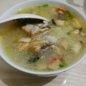 看个人喜好,想吃米粒比较烂的还是粒粒的,边搅拌边拿捏噢。差不多了,把刚才炒的香菇倒进锅里↣加盐鸡精调味↣关火↣洒上芹菜珠,洒点胡椒粉~