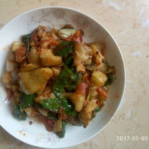 接着放入辣椒块用油煸炒,有花纹盛出。