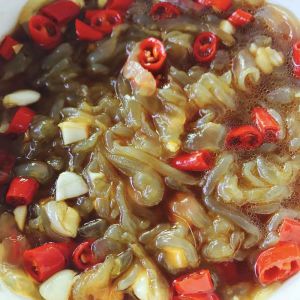 把调好的酱料和海蜇皮混合一起搅拌均匀,一份酸爽可口的海蛰皮就做好咯