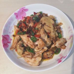 热锅,倒适量油,等油热了把花椒倒进去炒,特别香,然后把青红辣椒们和蒜倒进去炒,加入生抽,盐,白胡椒粉,一丢丢醋和糖,等炒均匀后扣在切好的鸡上面,尝一口,肉质特别滑嫩,汁水麻麻辣辣的,超好吃!