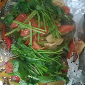 鱼上面的放香菜豆腐皮和西红柿都要先炒一下。油放多一点。先放番茄炒出汁,然后在放豆皮。加点水,然后,煮开之后放调味料。然后把的菜倒在鱼身上。再放上香菜。大火200再烤十五分钟ok了。喜欢吃辣的,就先在锅里炒一下辣椒豆豉。好放入豆腐,木耳,芹菜,等喜欢菜。可以放点水,然后煮一会儿然后放调味料。起锅然后倒在鱼身上然后再烤一下就可以了。