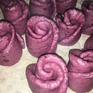 之前的步骤没想起来拍。紫薯去皮上锅蒸,蒸好趁热压成糊状,过筛。我今天没有过筛,懒。过筛后口感之类的都会好很多。蒸紫薯的时候把酵母用温水泡上。我用的自己发的酵头,所以不知道酵母要用多少。 紫薯处理好把紫薯和面粉混合,倒入酵母,适量水揉面