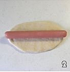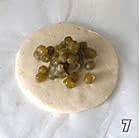 从冰箱中拿出剩余的面团,分别擀成圆形,放入适量的蜜豌豆。
