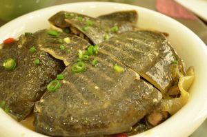 第三步,锅中放入2量菜籽油,烧7,8成热.下入甲鱼块,爆炒甲鱼.然后添加少许白糖,在滴一点生抽,放入姜片,再炒1,2分钟,加入黄酒,矿泉水.大火烧开.加盐.加小米椒,味精,鸡精,小火焖至软烂.在收汁,加入青红椒,淋点猪油.
