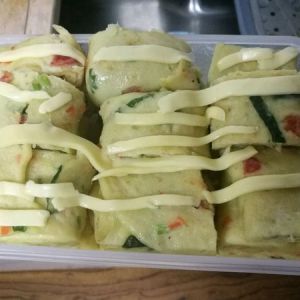 将之前准备好的食材火腿和干奶酪可切丝,卷在已烙好的鸡蛋饼内,切成长方形装盘即可。