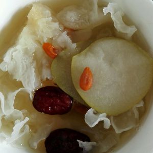 银耳泡半天,放入梨,红枣,枸杞,冰糖,高压锅小火熬一个小时