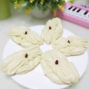 把圆形面皮上面刷一层油,对折,再刷一层油,再左右对折,最后成圆形的四分之一形状时,按照如图切成三份,按照上图把最小的一份再切开,分放在两个大面皮上面,用筷子压一下。