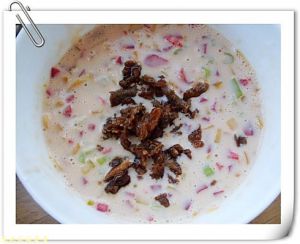 鸡蛋打散,放入彩椒丁,豆渣、少量面粉、盐、胡椒粉,搅拌均匀.