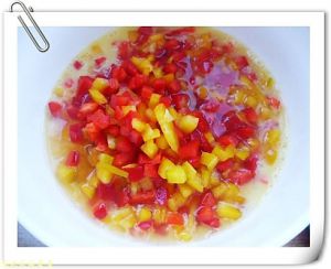 红黄彩椒洗净,切成小丁。