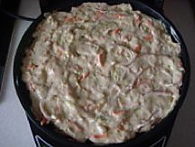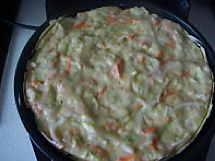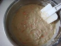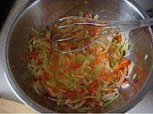 鸡蛋打散,角瓜和胡萝卜擦成丝,元葱也切细丝,加点胡椒粉、盐、鸡精,搅拌在一起。