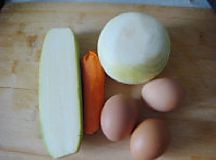 准备好原料:三个鸡蛋、半个角瓜、半根胡萝卜、元葱。