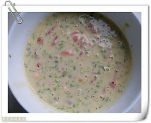 再加入适量的水,放入适量的面粉,西红柿碎、盐、胡椒粉,搅拌成面糊