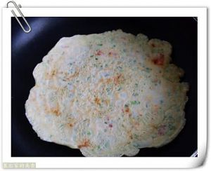 平底锅置火上,少抹一点油,倒入适量面糊,迅速转动锅体,让面糊铺满锅底。