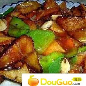 以少量热油爆香葱花及蒜茸, 加高汤、生抽、糖、盐、茄子、土豆和青椒块 略烧;