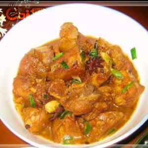 我是直接用炒锅,烧开后,用中火慢炖了足有40分钟,中途若干次开锅用筷子插试猪蹄的软硬程度。终于,至感觉猪蹄足够软滑的时候,撒入蒜叶,收干汤汁,美味的红烧猪蹄出炉!