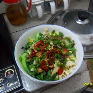 3:把葱花、香菜、姜米(春天吃点姜好呢)、蒜米爆一下会更香,不过这次我直接放在上面了,然后把酱料用调羹搅拌一下均匀倒在碗里。