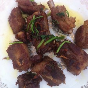 锅里放少许油,热后加入冰糖,再放排骨。直到冰糖完全融化,排骨变金黄色
