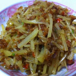 锅中再加入油,放入土豆丝,炒到变软之后调入盐,鸡精。