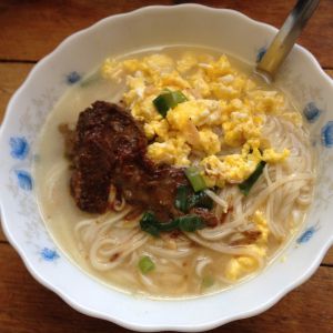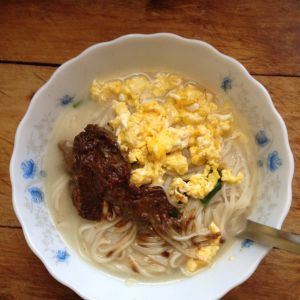 面上撒入鸡蛋碎,加入一勺爸爸用肉丁炒的豆瓣酱。
