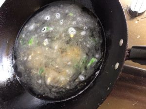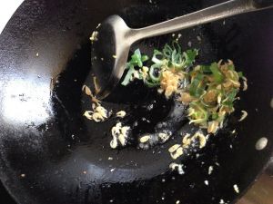 锅底加少许油,大火,油热后加入虾皮,再加葱花,虾皮金黄葱花爆香。