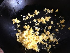 锅内放少许油,沾锅锅底即可,小火,低温,将鸡蛋打入锅中,用筷子划散,不停地滑动不能让鸡蛋出现大块的凝结,方向无所谓,见大部分凝固,有少量液体时关火,余温加热鸡蛋,30秒后盛出。