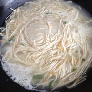 煮沸后,可见汤是白色的,秘密就是上一步加的是温水,「热水出白汤」