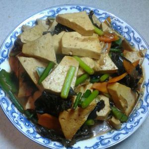 将生抽,老抽,糖,蚝油一起盛碗中备用。油热六七成热放花椒,葱姜丝爆香。随后放萝卜片,蒜薹段反炒之段生,在放豆腐反炒,再将备用生抽老抽佐料倒入锅里反炒几下加开水,盐适量炖2分钟点醋,鸡精完成。
