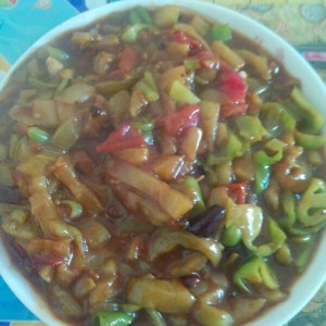 将多余油倒出,锅里留少许油起火加入红辣椒炒香,放入西红柿、青椒、茄子开大火炒片刻,将糖醋汁加入快速翻炒片刻。然后关小火加盖焖2分钟,就OK了