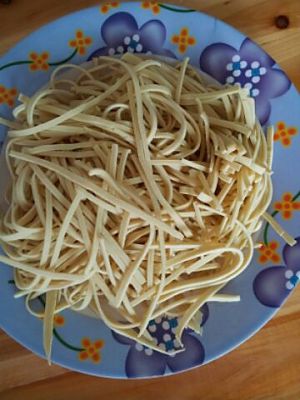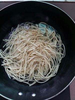 大勺上火,先把水烧开,在下入干豆腐,开锅后三十秒捞出,用凉水冲一下即可,在用手把干豆腐里面的水,挤出,放入盆中备用