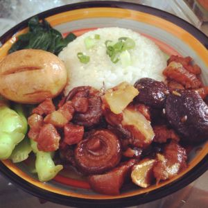 上海青焯水,和米饭及卤肉放摆盘撒上葱和芝麻搞定!