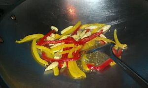 起油锅先将甜椒及玉米笋下锅拌炒。