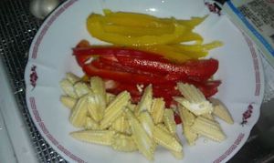 将红色及黄色甜椒切丝,玉米笋切滚刀快备用