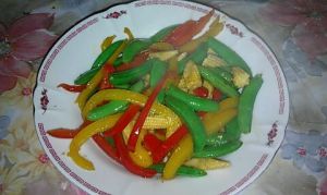 适时放入甜豆夹拌炒,加入盐及芥末椒盐(我们家不吃味精及鸡精,你们可以加)起锅前淋上香油就可以了。