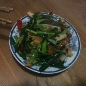 把姜放入热锅里炒香,加肉,炒至变色,再加入青椒和青蒜炒匀即可出锅