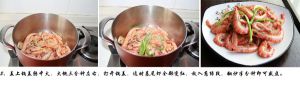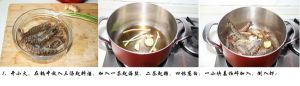 开小火,在锅中放入三汤匙料酒,加入一茶匙海盐,二茶匙糖,四根葱白,一小块姜拍碎加入,倒入虾;